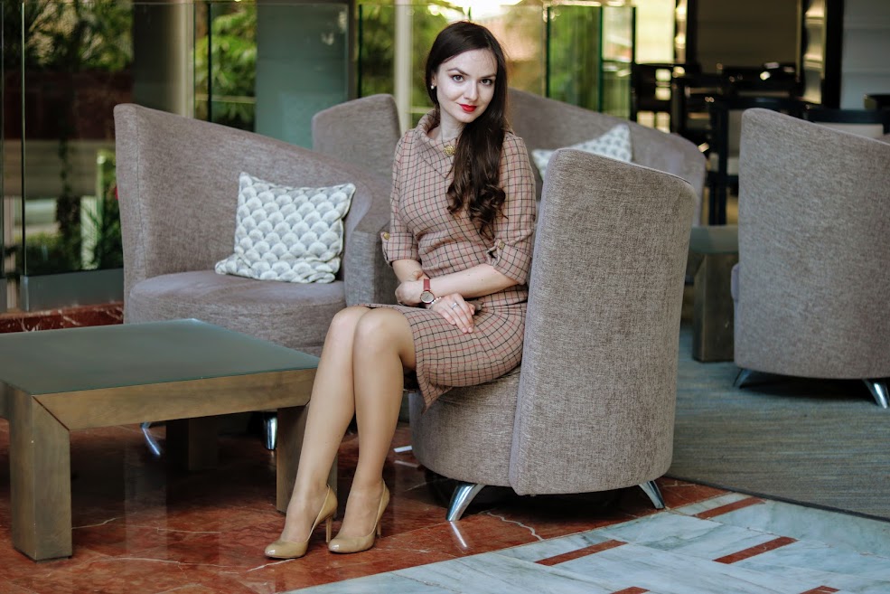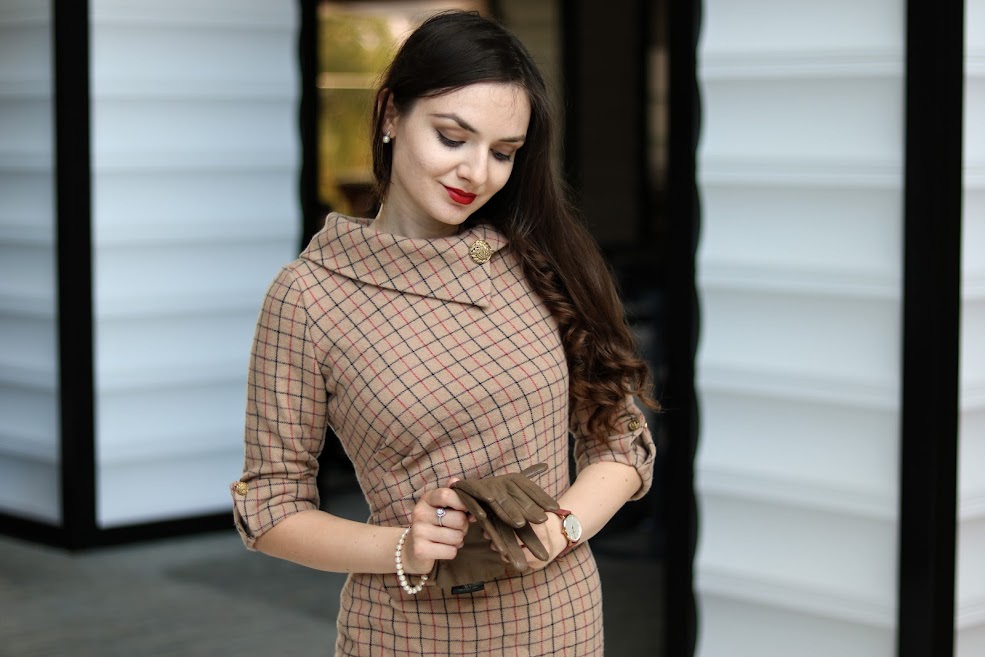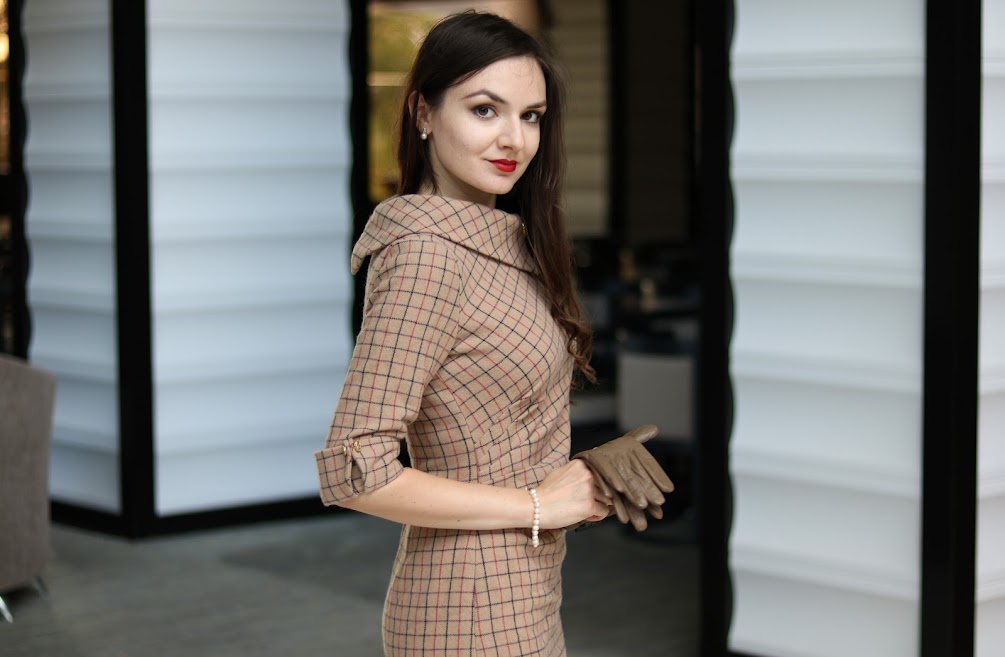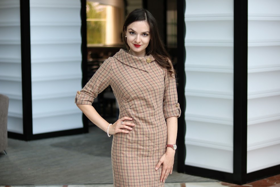 As soon as I saw check check wool coating fabric on Minerva I knew I have to sew a dress out of it. It might sound strange since this fabric is listed as a coating one. But the picture shows a good drape and thickness of the material that made me confident in my plans. It’s 100% wool which is the best choice for the garment that will be fantastically cozy and warm, yet perfectly breathable.