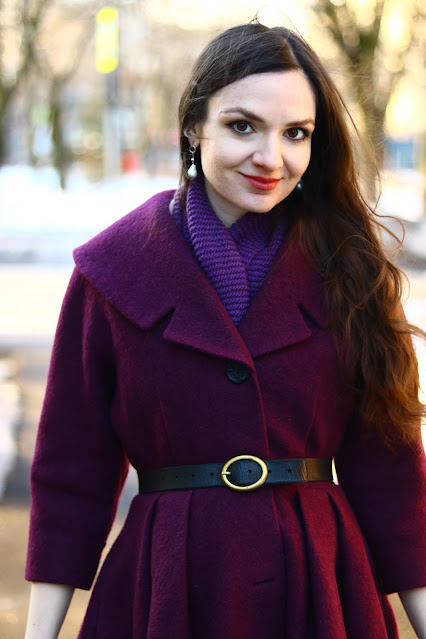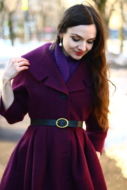 I paired this pattern with beautiful wool coating fabric in Wine colour. It’s a boiled wool fabric which is perfect for a warm, but still quite light coat that requires drape and folds or darts, and that’s what I needed. It’s important to note that this material has a stretchy base, so it needs to be stabilised and interfaced. But it still doesn’t frail so it’s easy to work with it. It should be pre-shrunk which can be done by steaming and wrapping in a damp towel.
